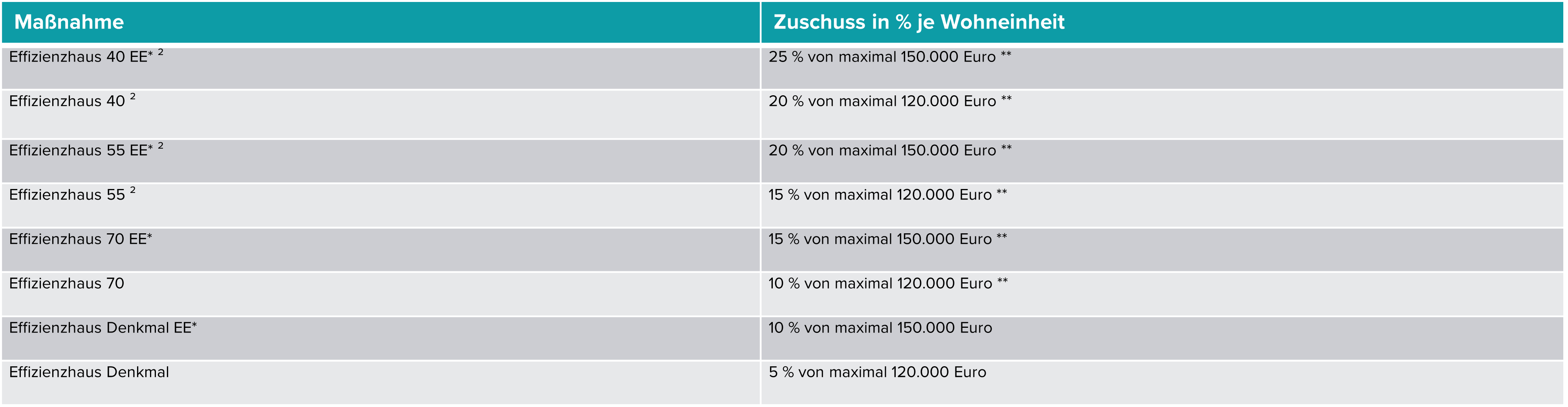 *Wird mit der geförderten Maßnahme ein im Förderprogramm „Bundesförderung für Energieberatung für Wohngebäude“ geförderter individueller Sanierungsfahrplan (iSFP) innerhalb eines Zeitraums von maximal 15 Jahren nach Erstellung des iSFP vollständig umgesetzt und mindestens die dort als individuelles Ziel definierte Effizienzhaus-Stufe erreicht, so erhöht sich der für diese Effizienzhaus-Stufe vorgesehene Fördersatz um zusätzliche fünf Prozentpunkte (iSFP-Bonus).